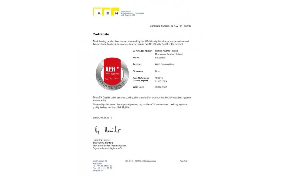 Właściwości prozdrowotne – sen na materacach SleepMed sprzyja Twojemu zdrowiu. Ich bezpieczeństwo i jakość potwierdza certyfikat AEH.