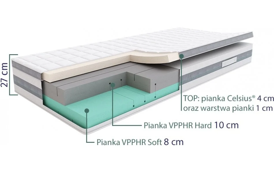 WKŁAD: 7-strefowy, odpinany top z pianki termoelastycznej Celsius® - Waterlily®- 5cm, dwie warstwy wysokoelastycznych pianek VPPHR, twarda – 10cm, miękka – 8cm