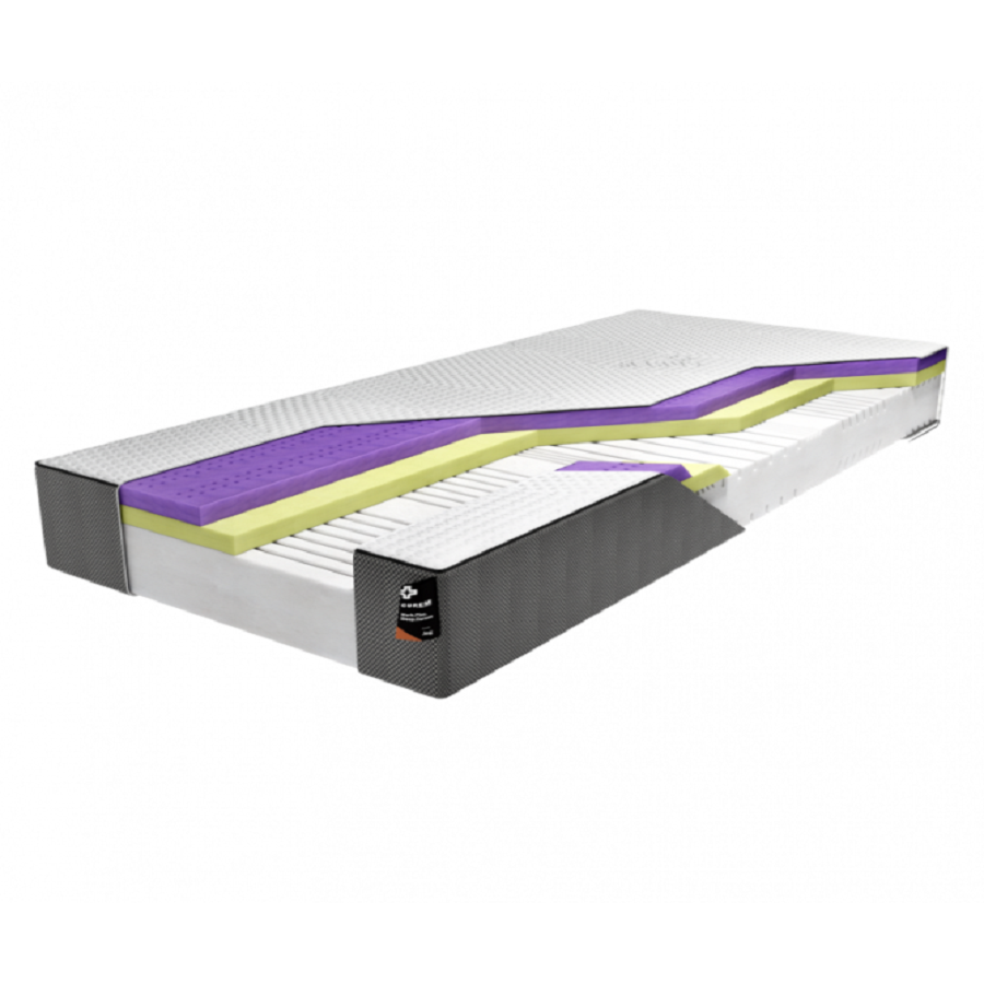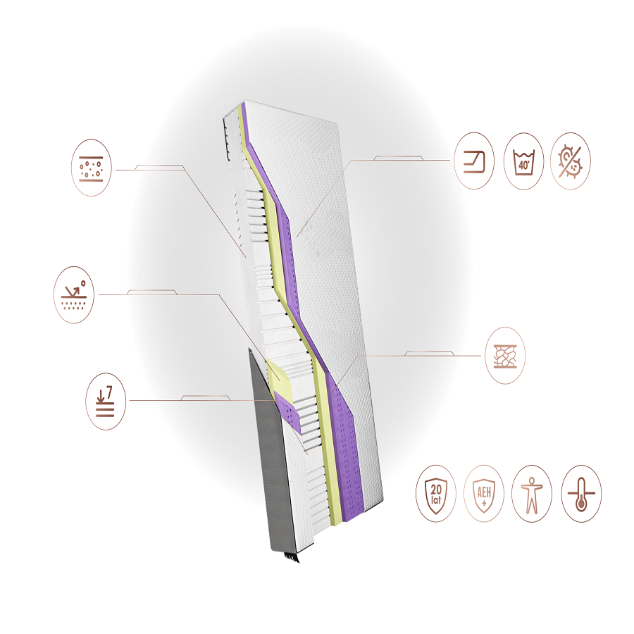 Pokrowiec ZEO CASE - Zwiększa właściwości wentylacyjne i termoregulacyjne materaca. Nowoczesny pokrowiec, obecny w każdym modelu, wyposażono w wielowarstwową taśmę 3D, którą umieszczono także na spodzie materaca. Wielowarstwowa struktura taśmy, skutecznie usprawnia cyrkulację ciepła oraz powietrza. Całości dopełnia antybakteryjna powłoka, o której czystość można dbać w łatwy sposób piorąc ją w pralce.
