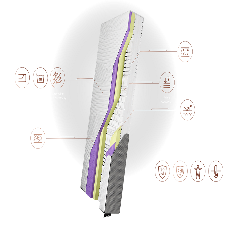 Model podzielony na 7 stref pozwoli Ci czuć komfort niezależnie od Twojej ulubionej pozycji snu. Ciało zachowa prawidłową postawę, a mięśnie będą wspierane bez względu na to, czy śpisz na brzuchu, plecach czy boku.