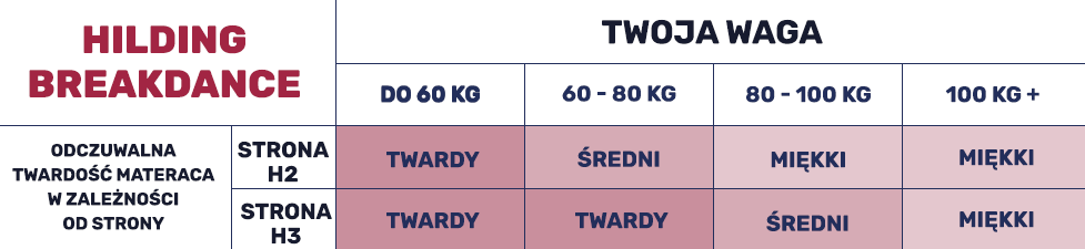 Breakdance Hilding to materac odwracalny dla dzieci i młodzieży. Jego podstawę stanowi wkład wykonany z elastycznej pianki Flexifoam o różnych twardościach. Po jednej stronie materaca znajduje się średniotwarda pianka Flexifoam o wysokości 8 cm, a po drugiej twarda pianka Flexifoam o tej samej grubości. Właściwe profilowanie i cięcie pianki Flexifoam zapewnia optymalną wentylację wkładu, co zwiększa higienę oraz komfort korzystania z produktu.