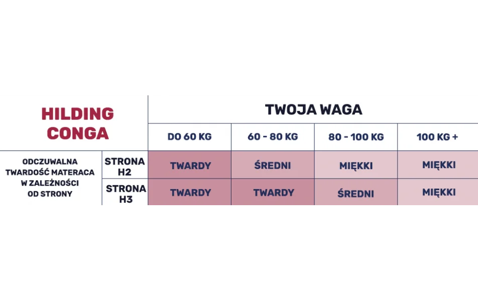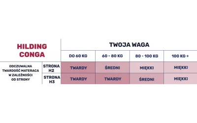 Dzięki wykorzystaniu nowoczesnych technologii i rozwiązań materac Conga Hilding to model o uniwersalnym zastosowaniu. Podwyższona twardość powoduje, że sprawdzi się świetnie jako wygodne podłoże dla osób o wysokiej wadze. Bardzo dobra elastyczność punktowa w 7 strefach twardości sprawia, że artykuł ten znajdzie zastosowanie jako materac dla par o dużej różnicy wagowej, wynoszącej minimum 30 kg.