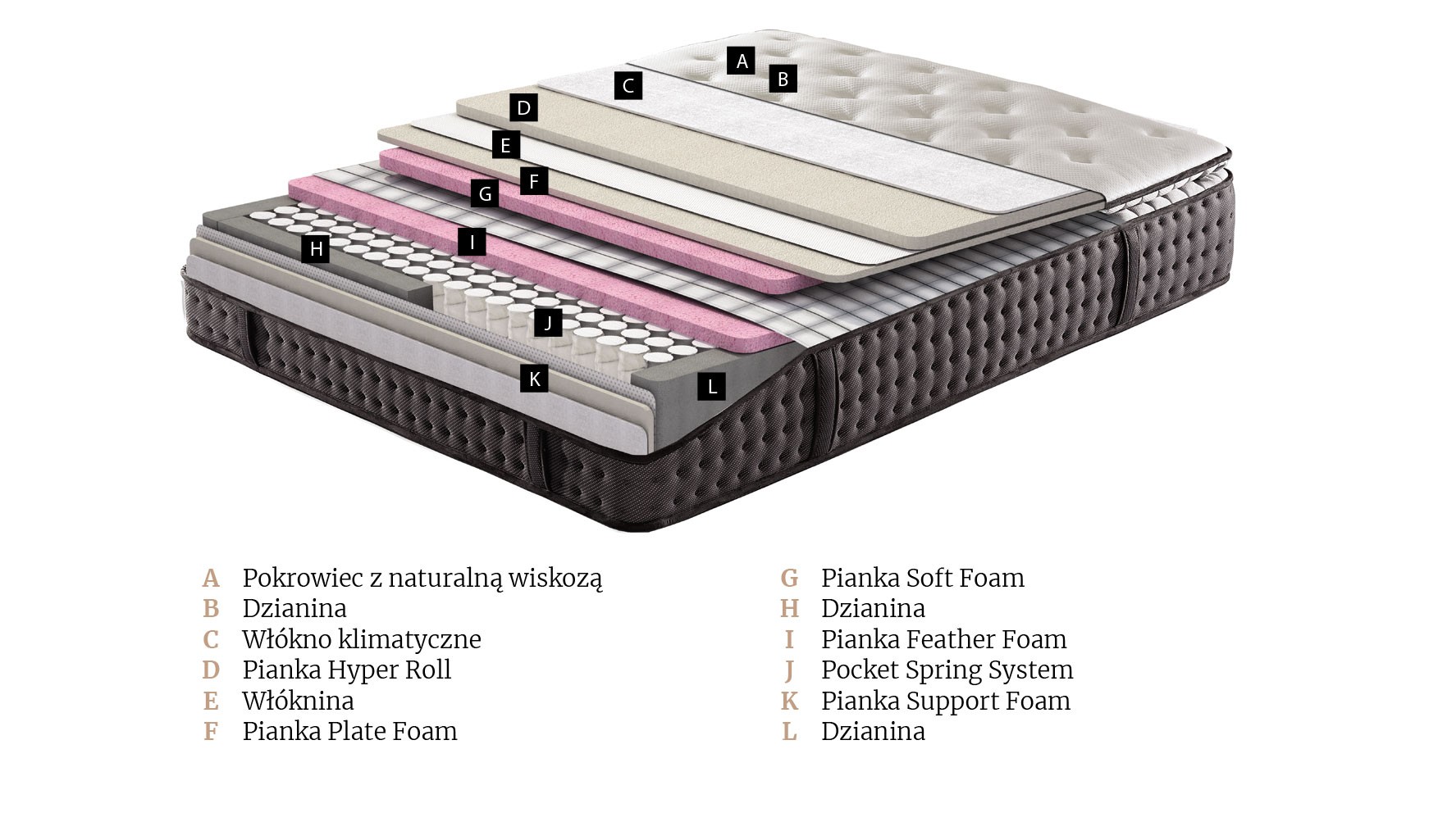 WKŁAD: tkanina z naturalną wełną, tkanina z jedwabiem, włóknina, pianka Hyper Roll, flizelina, pianka Plate Foam, pianka Soft Foam, dzianina, piana Feather Foam, Pocket Spring System, pianka Support Foam.