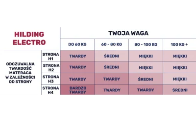 Fakt, że możemy dopasować twardość materaca Hilding Electro sprawia, że jest to wyjątkowo uniwersalny model. To produkt stworzony zarówno dla osób cięższych, jak i lżejszych, wysokich i niskich. To także świetny wybór dla par, osób z problemami z kręgosłupem oraz tych, którzy nie są pewni jaką twardość materaca wybrać. Polecamy go też użytkownikom aktywnym fizycznie - konstrukcja, która tworzy materac Electro Hilding hybrydowy zapewnia szybką regenerację zmęczonych mięśni.