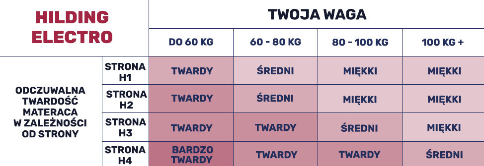 Fakt, że możemy dopasować twardość materaca Hilding Electro sprawia, że jest to wyjątkowo uniwersalny model. To produkt stworzony zarówno dla osób cięższych, jak i lżejszych, wysokich i niskich. To także świetny wybór dla par, osób z problemami z kręgosłupem oraz tych, którzy nie są pewni jaką twardość materaca wybrać. Polecamy go też użytkownikom aktywnym fizycznie - konstrukcja, która tworzy materac Electro Hilding hybrydowy zapewnia szybką regenerację zmęczonych mięśni.