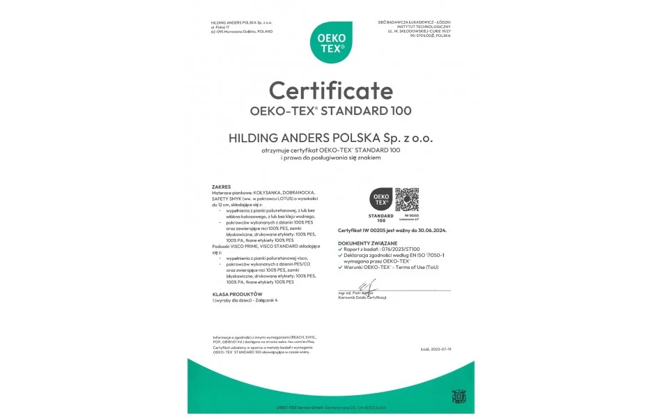 - certyfikat Oeko-Tex® potwierdzający brak substancji szkodliwych dla zdrowia w wykorzystanych materiałach, pozytywna opinia Instytutu Matki i Dziecka (nr Op-4850-5, ważna do 15.05.2025 r.).