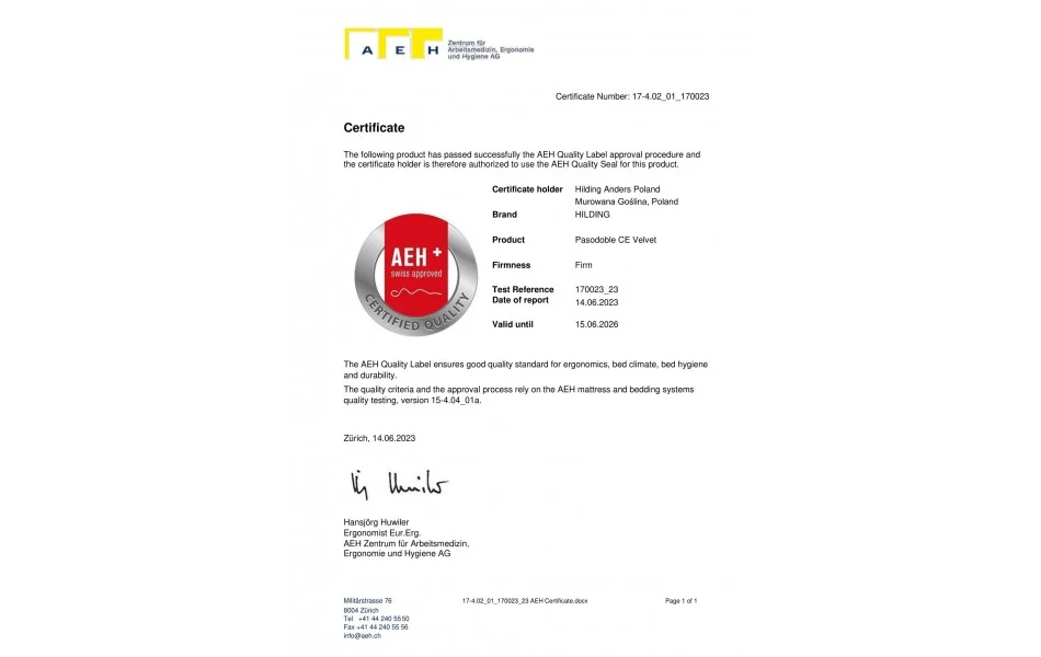 Szeroka gama rozmiarów materacy z serii Hilding Pasodoble pozwala na łatwe dopasowanie ich do dowolnej ramy łóżka jedno- lub dwuosobowego. Status wyrobu medycznego potwierdza wyjątkowe właściwości produktu w zakresie profilaktyki wad postawy. Wysoką jakość i bezpieczeństwo stosowania artykułu poświadczają również inne certyfikaty, m.in. OEKO-TEX – atest szczególnie ważny dla alergików oraz certyfikat AEH szwajcarskiego instytutu badającego ergonomię i dopasowanie materaca do ciała.