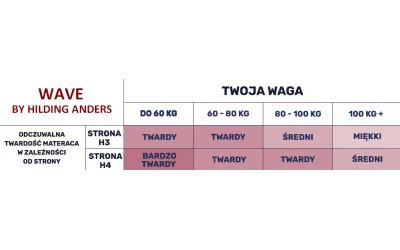 Wave to materac o nowoczesnej konstrukcji, która oparta jest na bazie profilowanej pianki PU o zróżnicowanej twardości, obłożonej po jednej stronie specjalną kombinacją dwóch inowacyjnych pianek - Super Soft Blue oraz HR Light Blue.