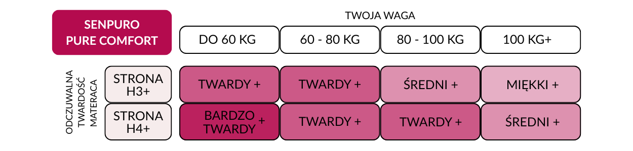 Senpuro Pure Comfort jest dostępny w wersjach twardej (H3) i bardzo twardej (H4), co oznacza, że raczej nie zapewni efektu "otulenia" i miękkości dla osób preferujących bardzo miękkie podłoże snu.