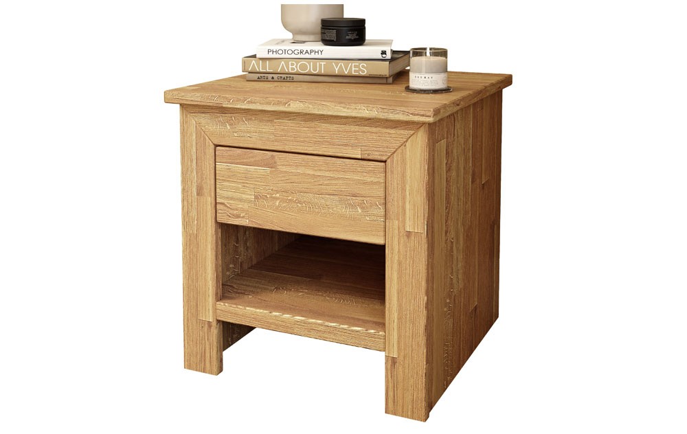 Szafka nocna Morreno Senpuro Teak wyróżnia się wysoką jakością wykonania i jest wykonana z trwałego drewna dębowego lub bukowego, co sprawia, że mebel jest odporny na zarysowania i zachowuje swój doskonały wygląd przez wiele lat. Posiada dolną półkę oraz szufladę z uchwytem wpuszczonym w krawędź, co pozwala na przechowywanie wszystkich niezbędnych przedmiotów przy łóżku. Dodatkowo, szeroki blat lekko wysunięty poza obrys podstawy zapewnia dodatkową przestrzeń użytkową. Mebel jest osadzony na nogach, co umożliwia łatwe odkurzanie sypialni. Całkowite wymiary szafki to 45 x 45 x 46 cm. Dostępne są dwa rodzaje drewna oraz różne kolory, co ułatwia dopasowanie mebla do wybranej aranżacji wnętrza. Szafka nocna Morreno Senpuro Teak to idealne rozwiązanie dla osób, które oprócz estetyki cenią sobie solidne wykonanie i funkcjonalność mebli.