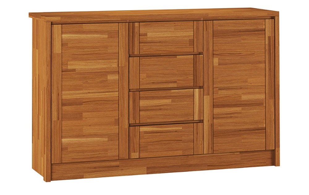 Komoda Prince IV to mebel stylowy i funkcjonalny. Zawiera cztery pojemne szuflady oraz dwie szafki, które pozwalają na przechowywanie wielu różnych przedmiotów, a także uchwyty wpuszczone w krawędzie, co ułatwia otwieranie i zamykanie szuflad. Wybierz rodzaj drewna i wybarwienie do stylu swojej sypialni.
