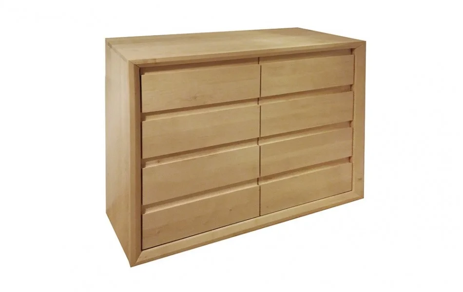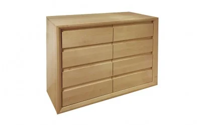 Komoda 90 4/4 Senpuro Eko to praktyczny mebel, wykonany z naturalnego drewna olchowego lub dębowego. Posiada 8 szuflad, co czyni ją idealnym rozwiązaniem dla osób ceniących sobie porządek w pomieszczeniu. Szuflady zamontowane są na prowadnicach kulkowych z cichym domykiem, a zamiast uchwytów zastosowano specjalny frez ułatwiający otwieranie.