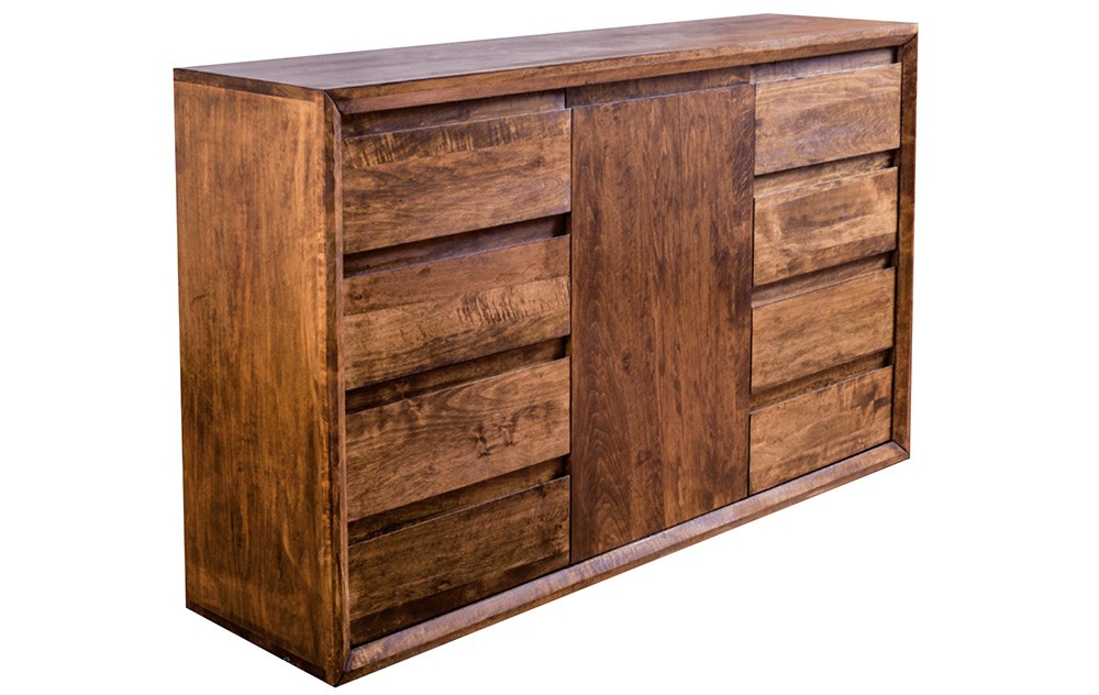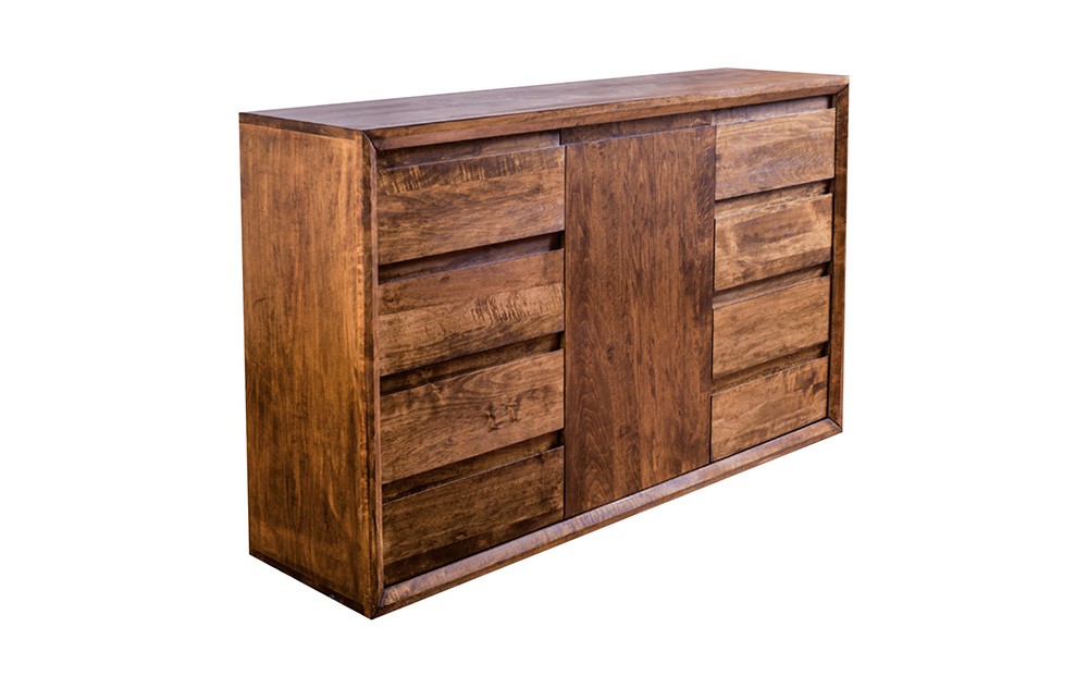 Komoda o szerokości 150 cm. Pośrodku półka za drzwiczkami z cichym domykiem, a po obu stronach 4 pojemne szuflady. W całości wykonana z litego drewna. Dopasuj rodzaj drewna i kolor jego wybarwienia do Twojej sypialni.