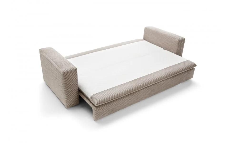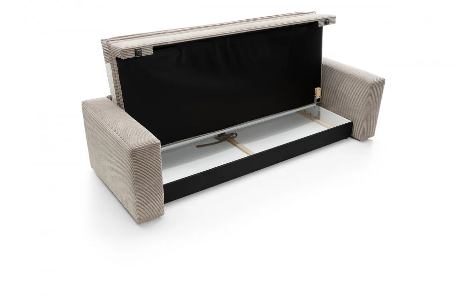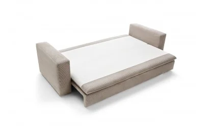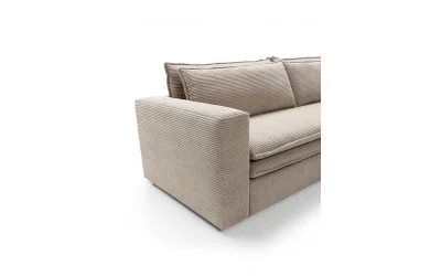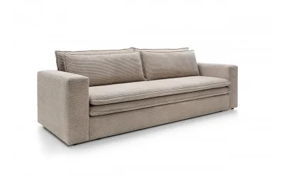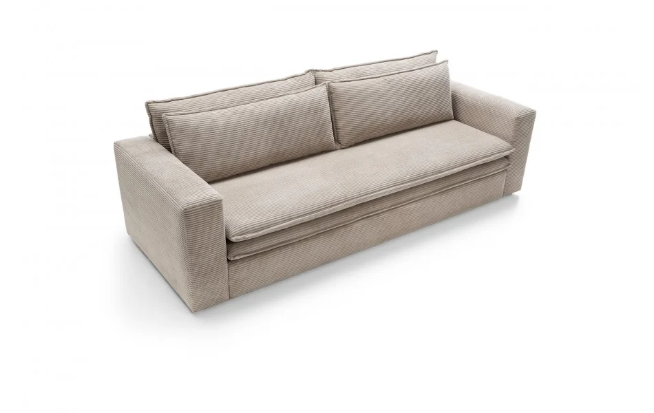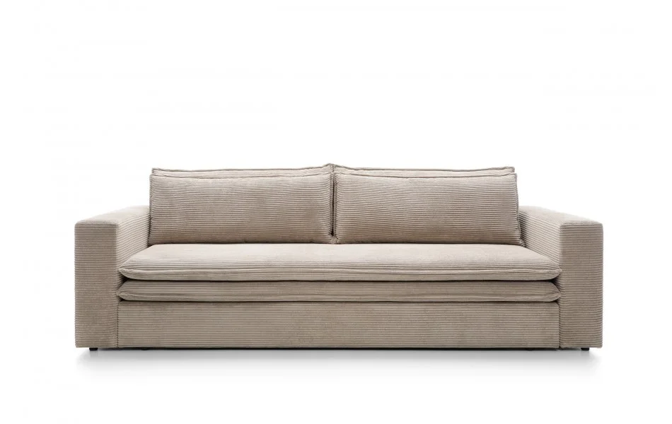 Jeden system, dwa oblicza kanapy. Możliwość wyboru szerokich lub wąskich podłokietników (str. 58-59) pozwala dopasować mebel do własnego stylu. Dwuwarstwowe siedzisko zmienia się w wygodną funkcję spania. Wielowymiarowość bryły uzupełnia mięsista tkanina sztruksowa.