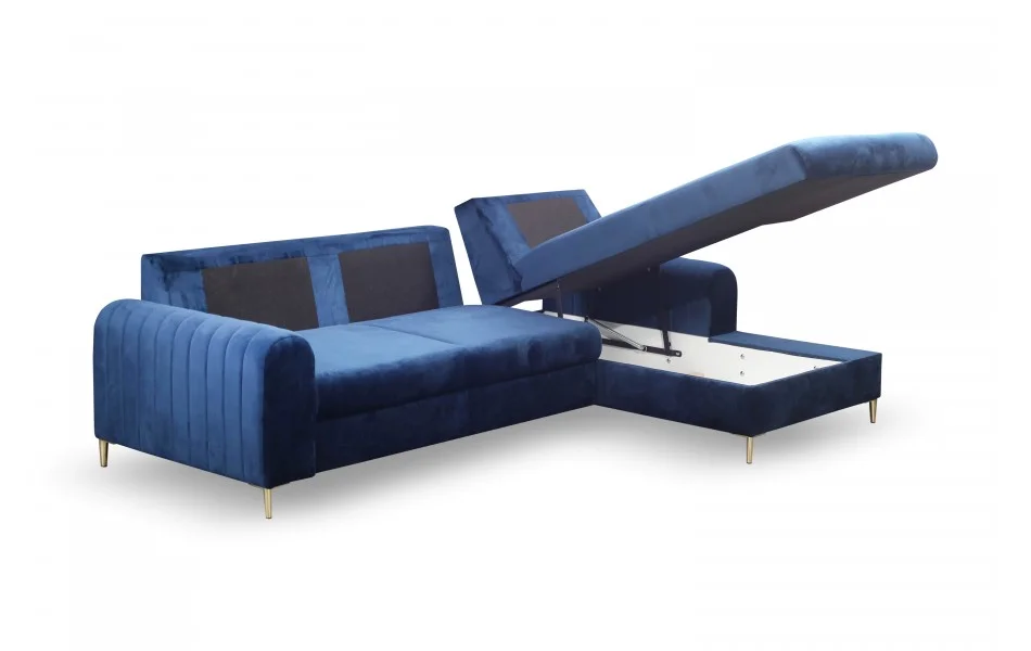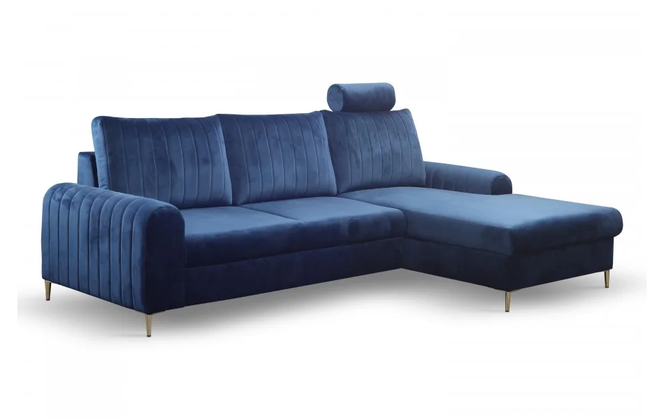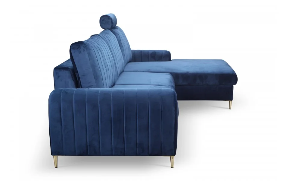 Narożnik Amsterdam to mebel idealnie pasujący do wnętrz w stylu glamour. Złote nóżki oraz przeszycia na bokach i poduszkach oparciowych nadają elegancji i przyciągają wzrok.