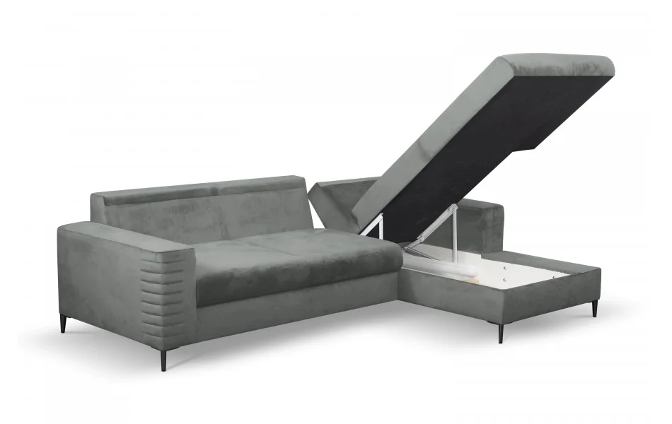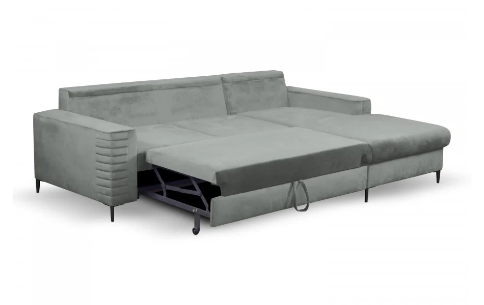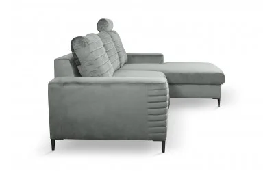Nowoczesny narożnik z oryginalnymi przeszyciami na bokach i poduszkach oparciowych. Model znajdzie zastosowanie w dużych salonach, jak i mniejszych pokojach dziennych.