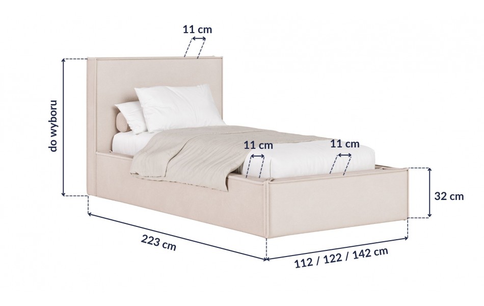 ● długość: 223 cm, szerokość: 112 cm, powierzchnia spania: 90x200 cm,