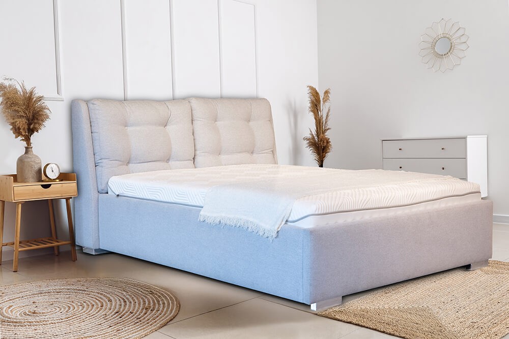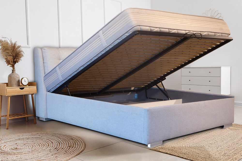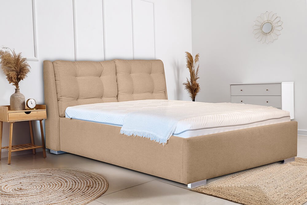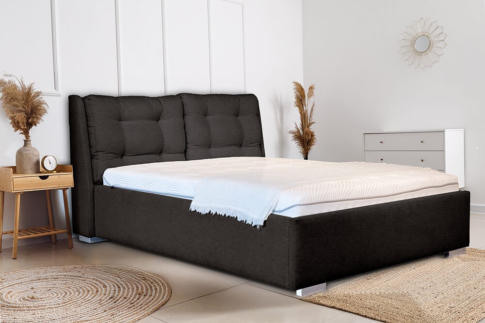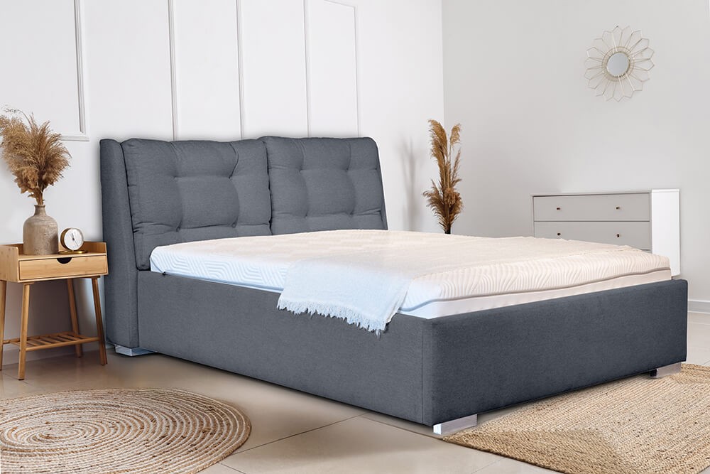 Model może być wyposażony w elastyczny listwowy stelaż na materac. Za dodatkową dopłatą możesz zamienić go na stelaż z praktycznym pojemnikiem na pościel lub pojemnikiem dwupozycyjnym z funkcją ścielenia.
