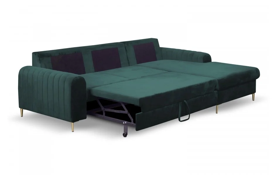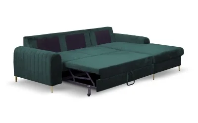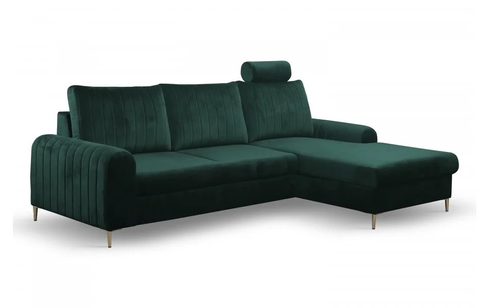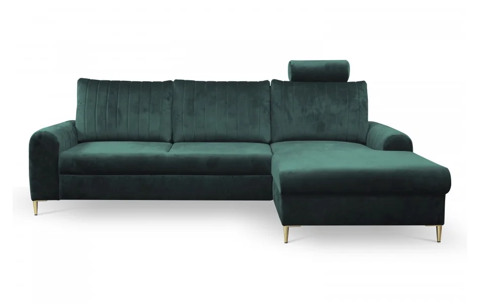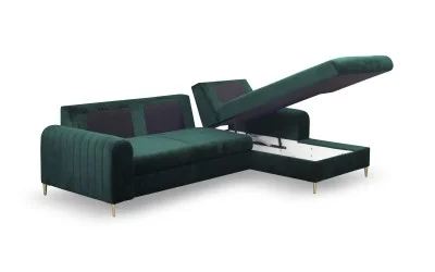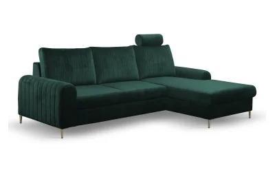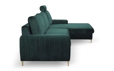 Narożnik Amsterdam to mebel idealnie pasujący do wnętrz w stylu glamour. Złote nóżki oraz przeszycia na bokach i poduszkach oparciowych nadają elegancji i przyciągają wzrok.